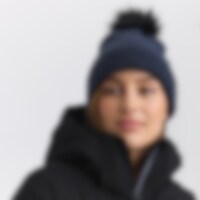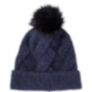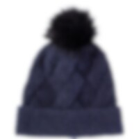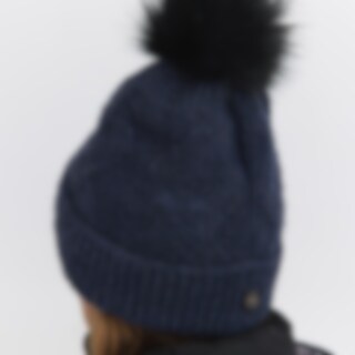 Varmende hue med dekorativ kabelstrik og pompon i imiteret pels.
