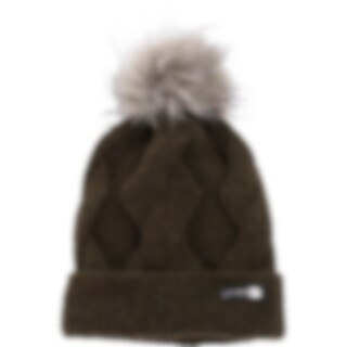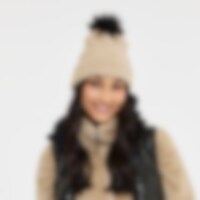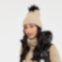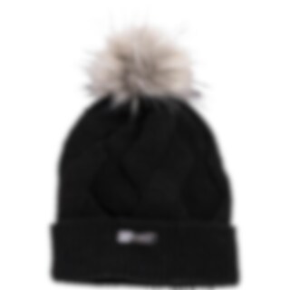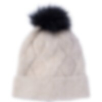 Varmende hue med dekorativ kabelstrik og pompon i imiteret pels.