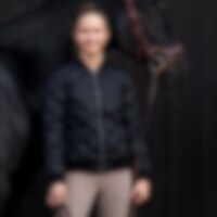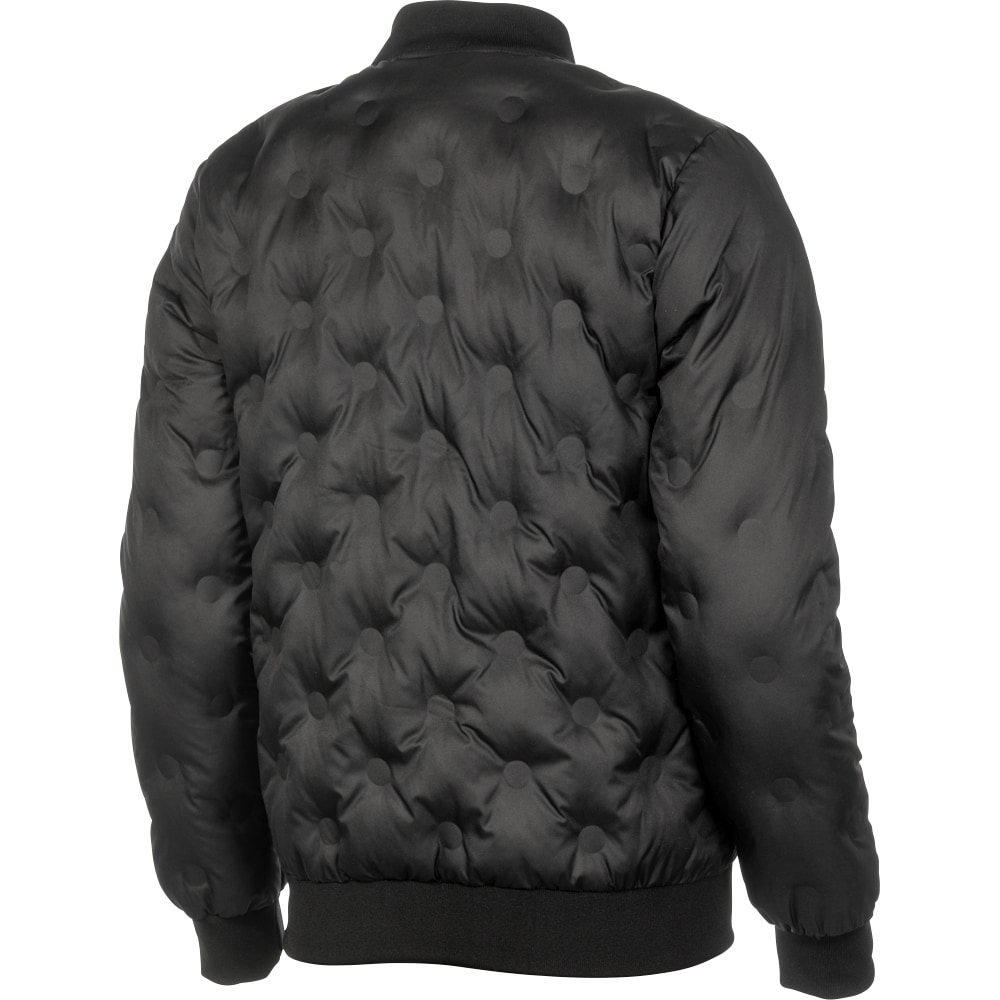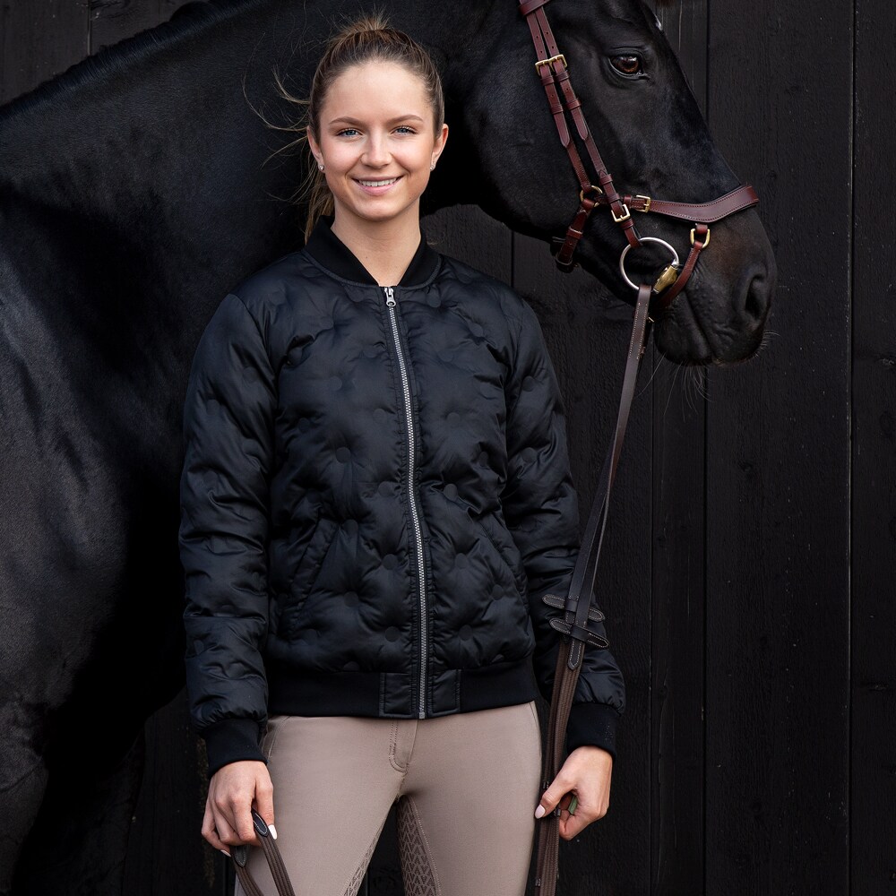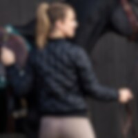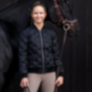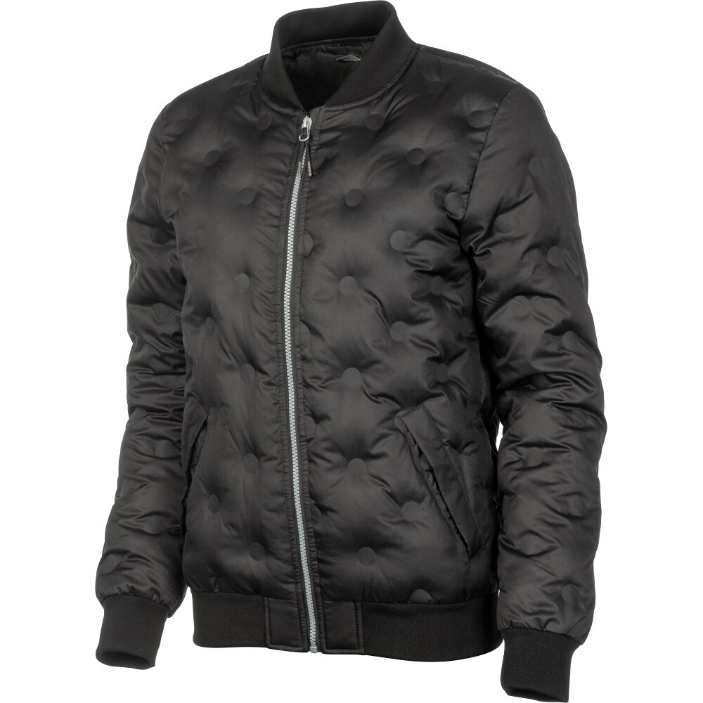 Jakke med svejset mønster, dvs. uden sømme i quiltningen. To lommer foran. Ribstrikkede manchtter i ærmekanter og ved krave.