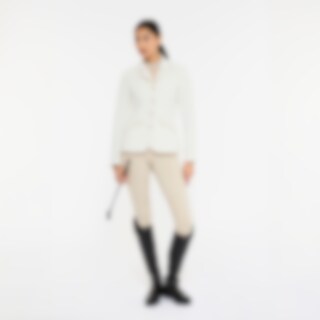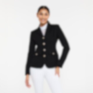 Stilren og blød jakke med figursyet pasform, der er perfekt til konkurrencer. Jakken er designet i boucle, som giver et klassisk og tidløst look. Siderne og undersiden af ærmerne er lavet af et stretchy funktionsmateriale, der giver optimal bevægelsesfrihed og komfort under ridning. Praktiske detaljer såsom to forlommer med klap gør, at du kan have nødvendigheder med dig. Blazeren lukkes med en skjult lynlås og dekorative knapper for en elegant finish uden at gå på kompromis med funktionaliteten. Den har også en dobbelt slids bagpå. Uforet.