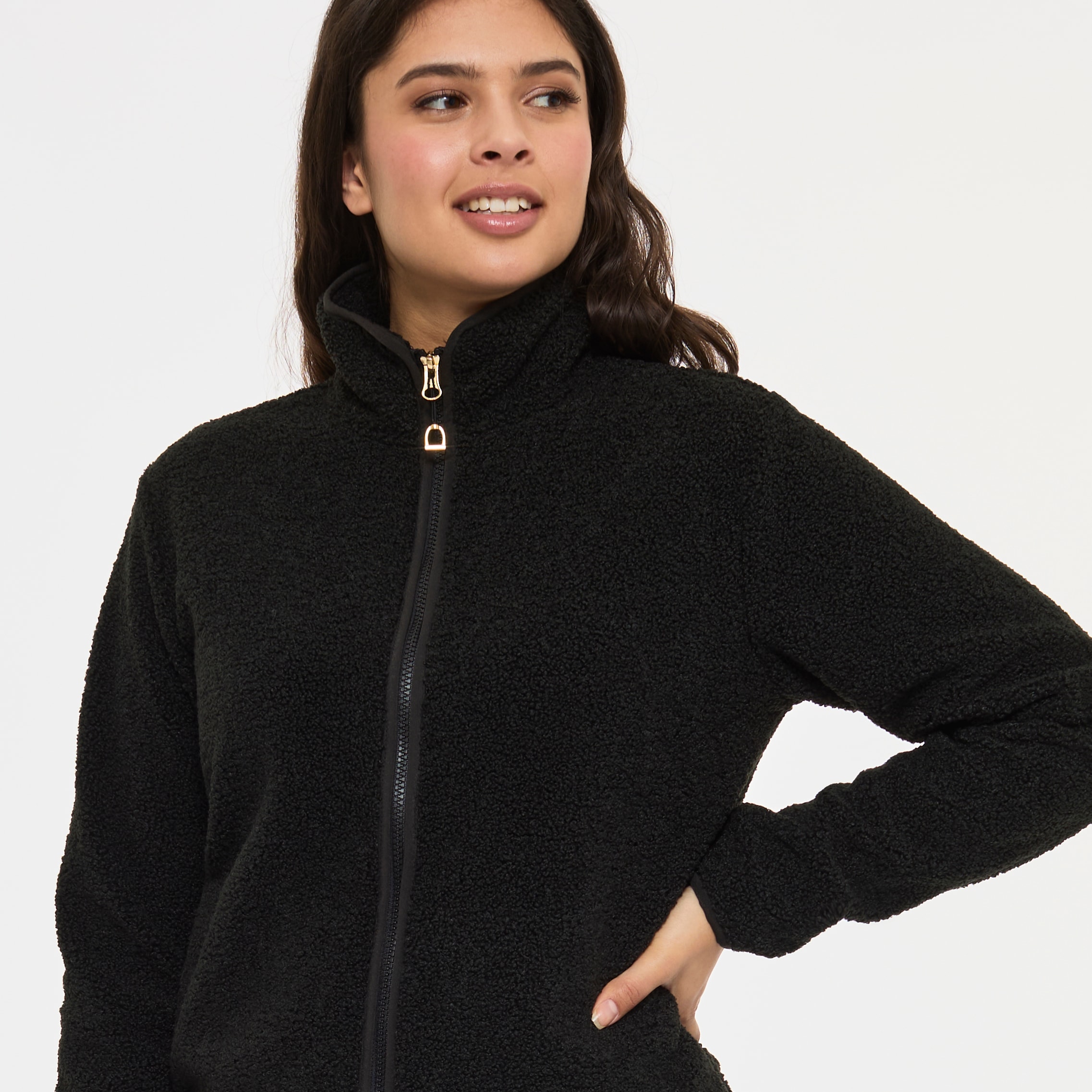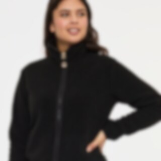 Blød fleecetrøje i blød luv med høj krave, lynlås foran og to åbne lommer.