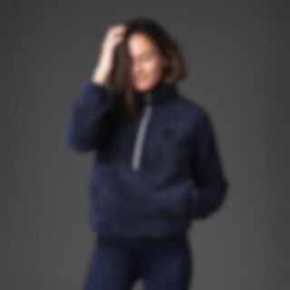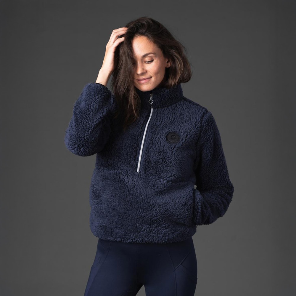 Superblød luftig teddyfleece-trøje, halv lynlås. Dekorativ quiltning ved skulderen. Lynlåsen er lang, så det er muligt at trække trøjen over hjelmen. Elastisk for forneden, ærmer og lommer.