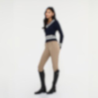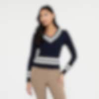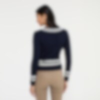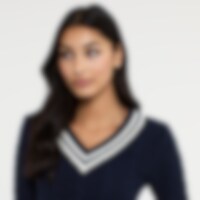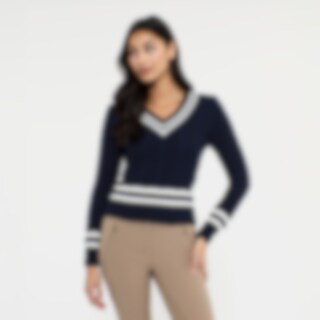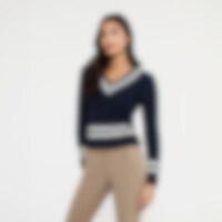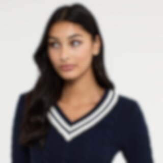 En stilfuld og klassisk kabelstrikket trøje. Trøjen har v-halsudskæring med kontrastfarvede detaljer langs kanten og forneden. Blød og varmende kvalitet. Ribstrikkede ærme- og underkanter.
