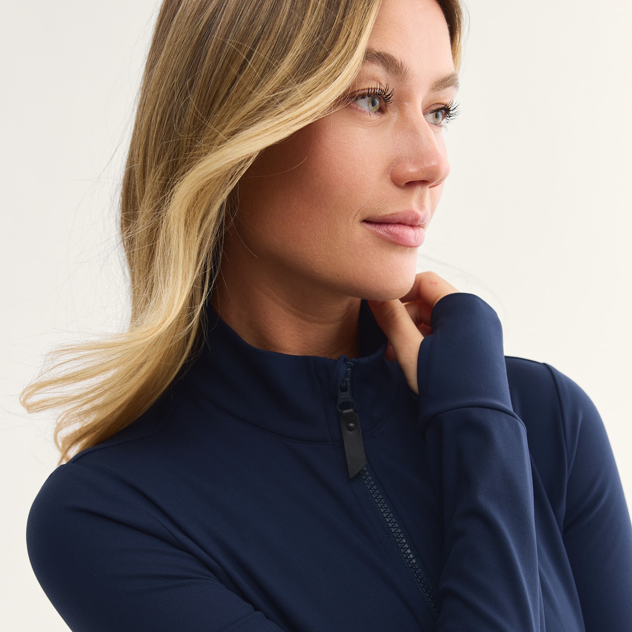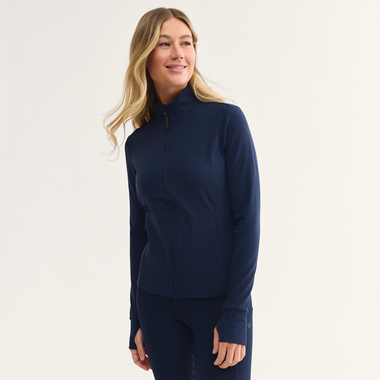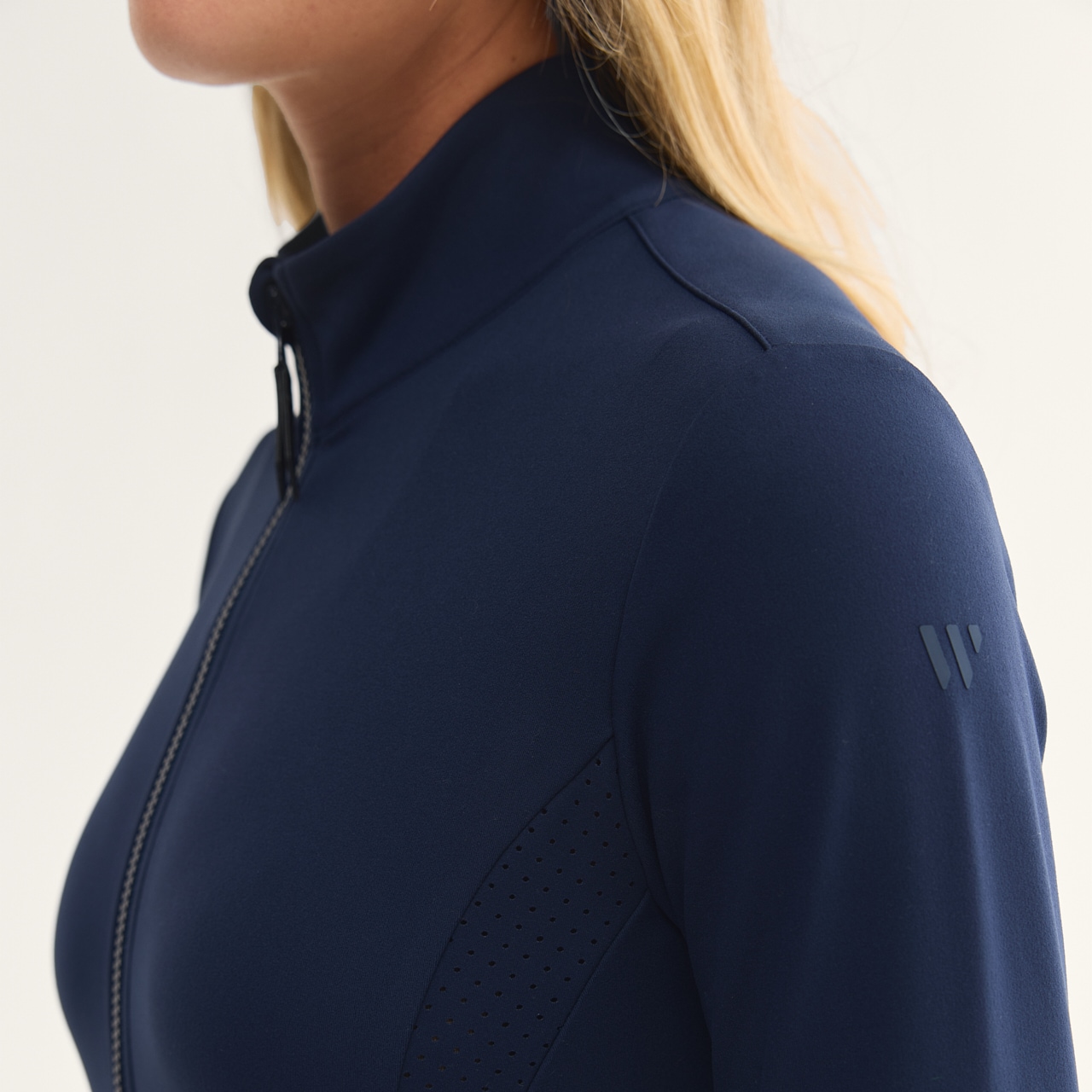 Cardigan med lynlås i blødt og elastisk funktionelt materiale. Kvaliteten er fugttransporterende og hurtigtørrende og holder dig varm og tør. Den strækbare kvalitet giver rigtig god komfort og stor bevægelighed. Dele med perforeringer, der sikrer god åndb