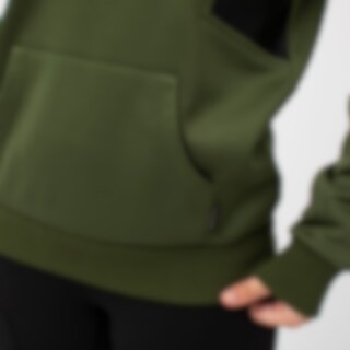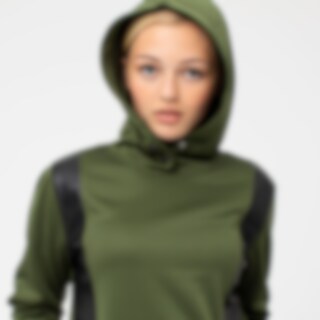 Sweatshirt med hætte i blødt og lækkert funktionsstof med børstet inderside. Åben, gennemgående lomme foran og med ribkanter i ved ærmekanter og i underkant. Dekorative knapper på hættens forside. Paneler i PU på forsiden af trøjen.