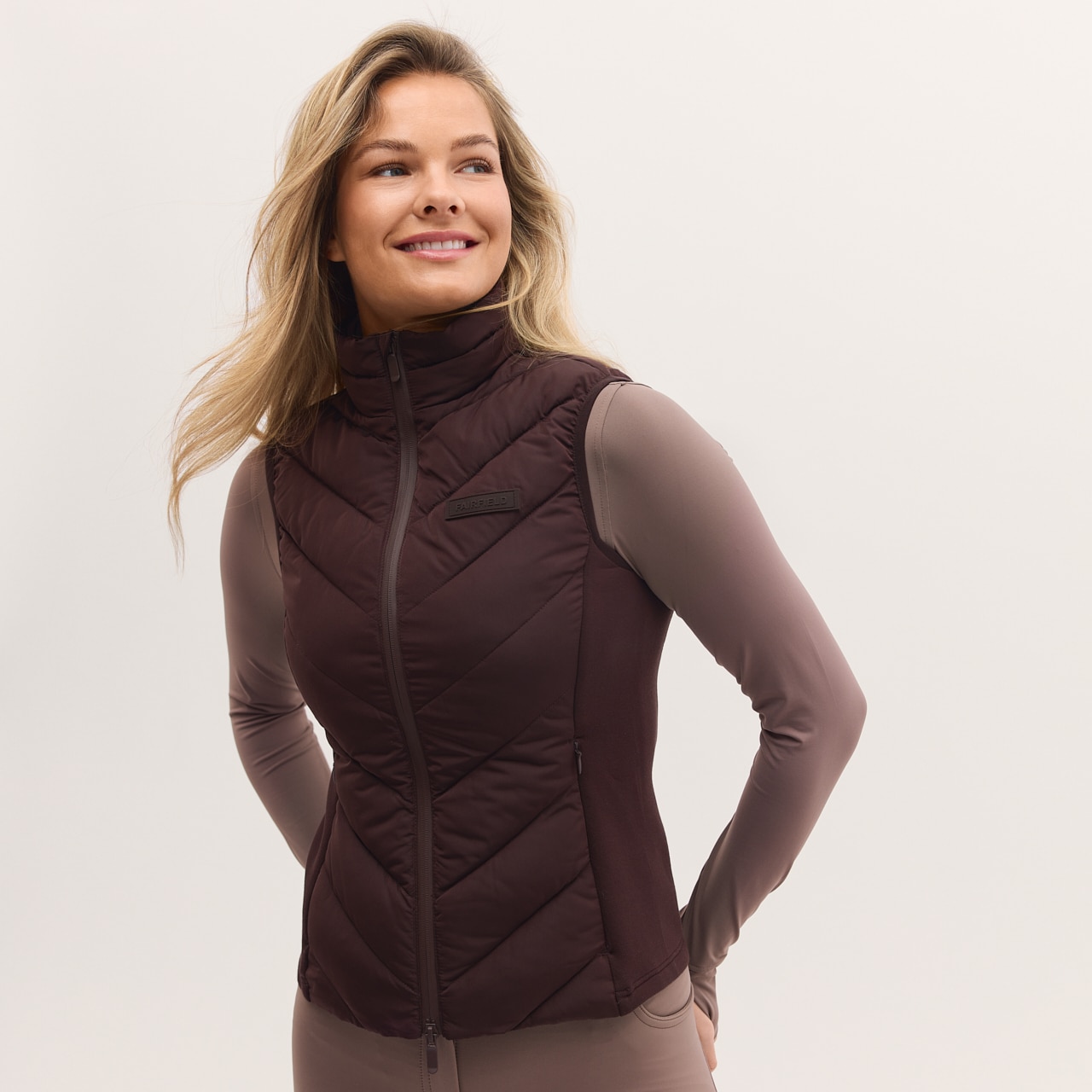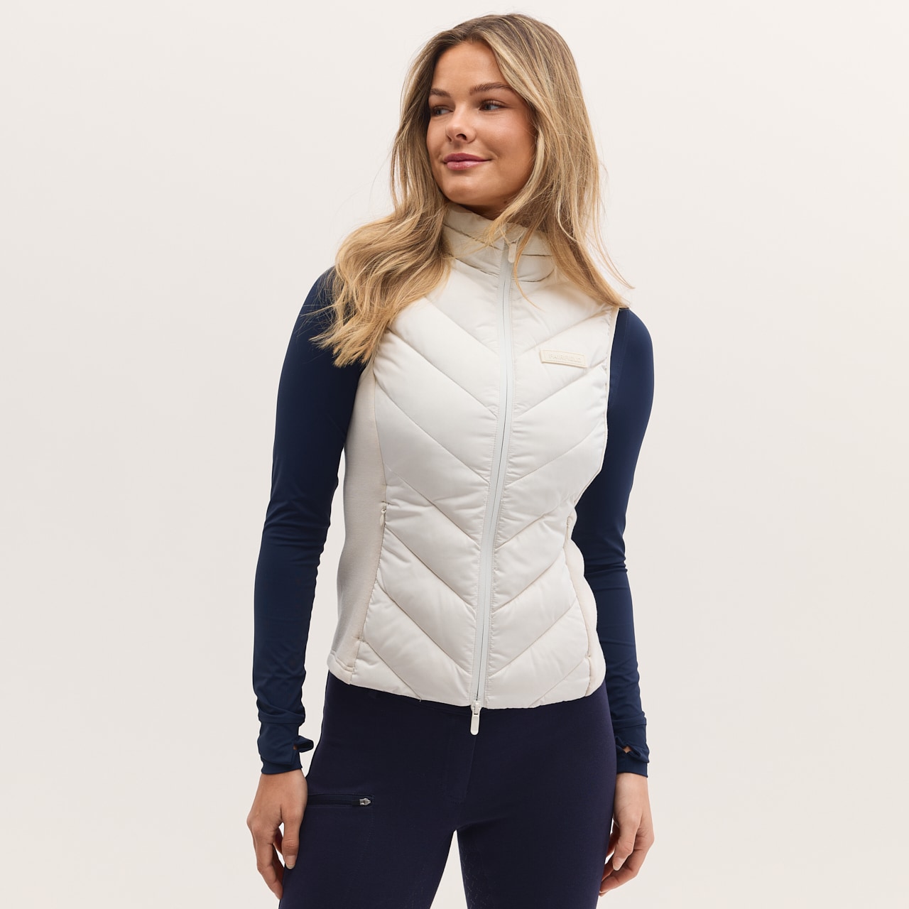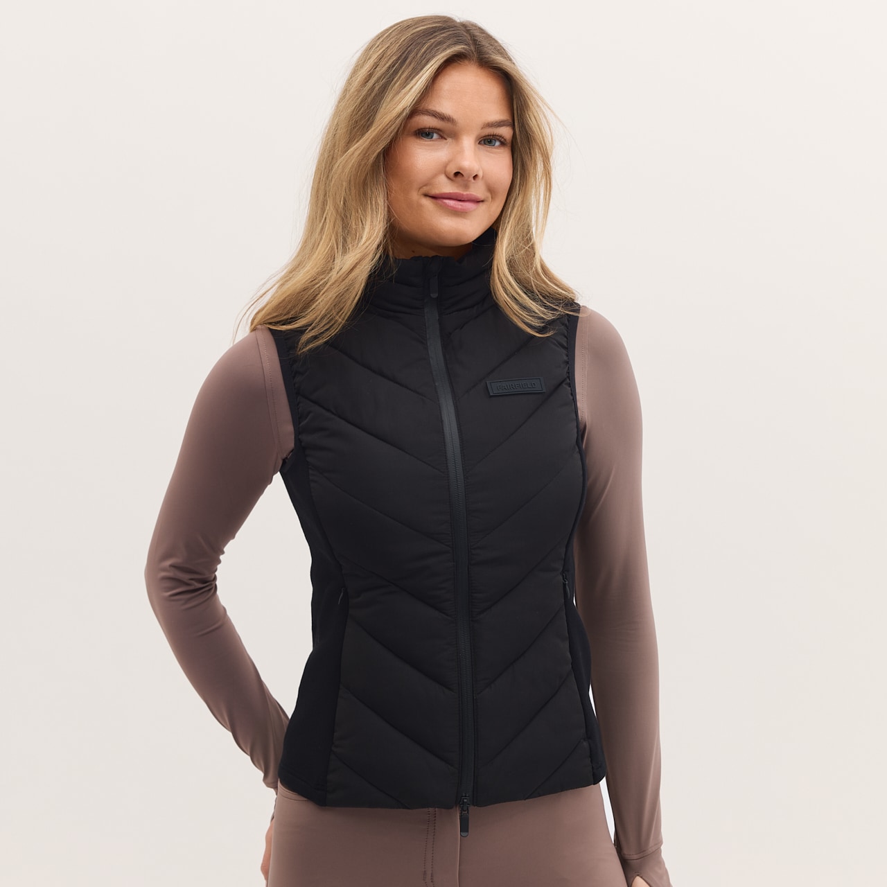 Sporty funktionalitet med et stilrent look. Vestens hybriddesign giver både varme og ventilation, når det er nødvendigt, hvilket gør den perfekt til både intensiv ridetræning og daglig brug.