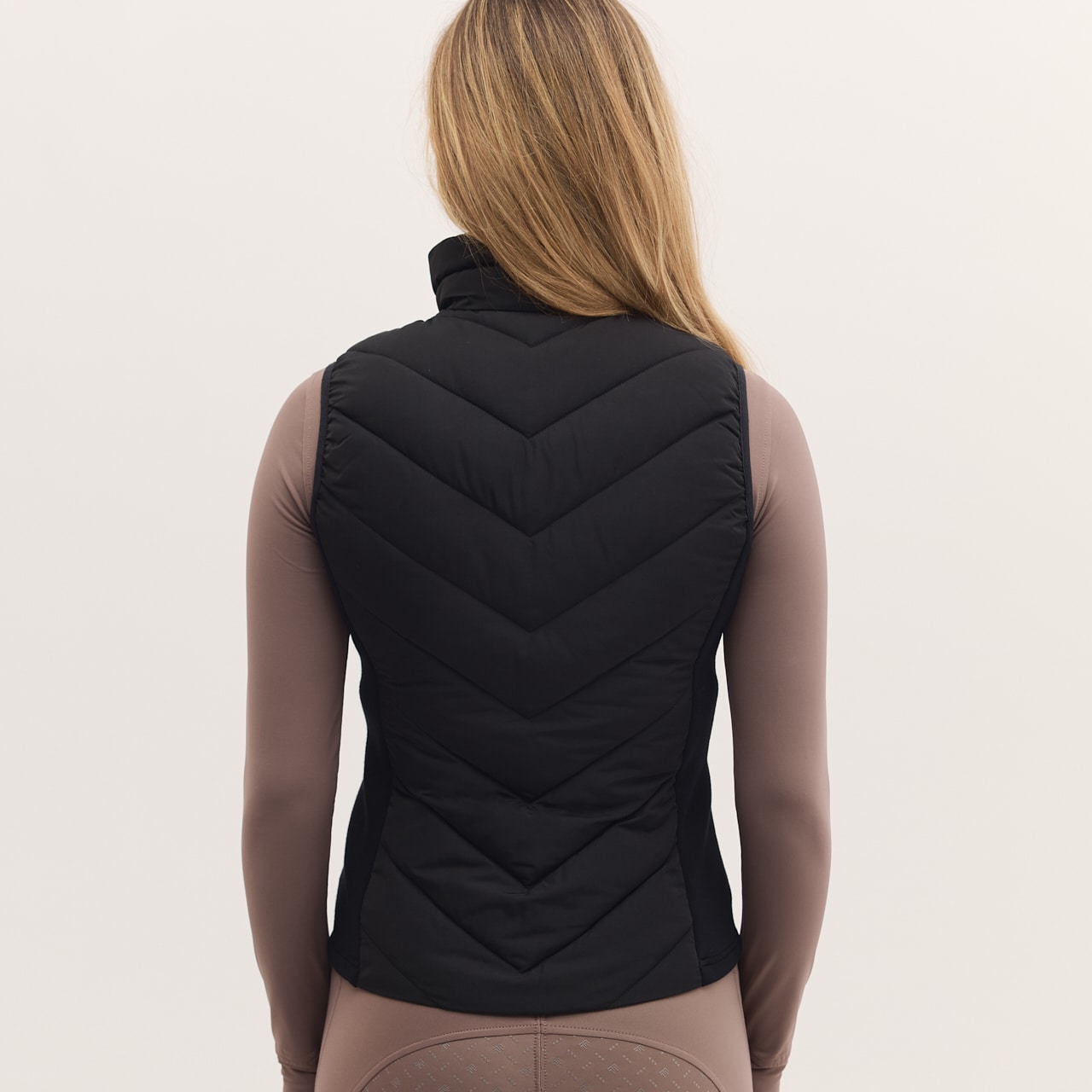 Sporty funktionalitet med et stilrent look. Vestens hybriddesign giver både varme og ventilation, når det er nødvendigt, hvilket gør den perfekt til både intensiv ridetræning og daglig brug.