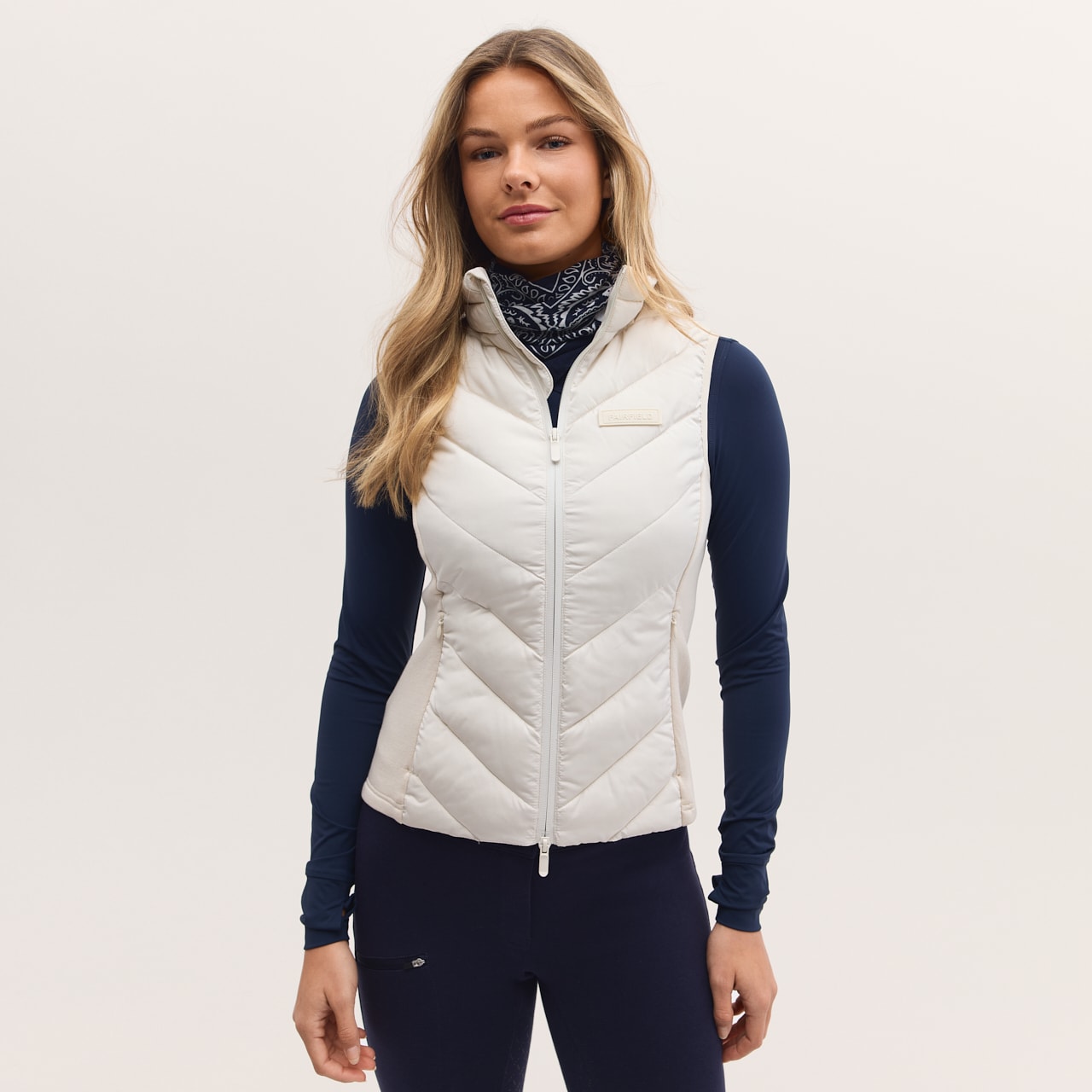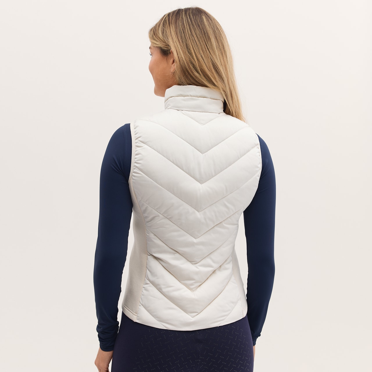 Sporty funktionalitet med et stilrent look. Vestens hybriddesign giver både varme og ventilation, når det er nødvendigt, hvilket gør den perfekt til både intensiv ridetræning og daglig brug.
