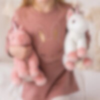 En enhjørning med en hvid pels, der er blød som fløjl, store glitrende øjne og et lyserødt glitrende horn i panden. Halen og manken er begge lange og pjuskede. 100 % polyester og kan vaskes ved 40 grader. Testet og godkendt i henhold til EN71 og CE-mærk