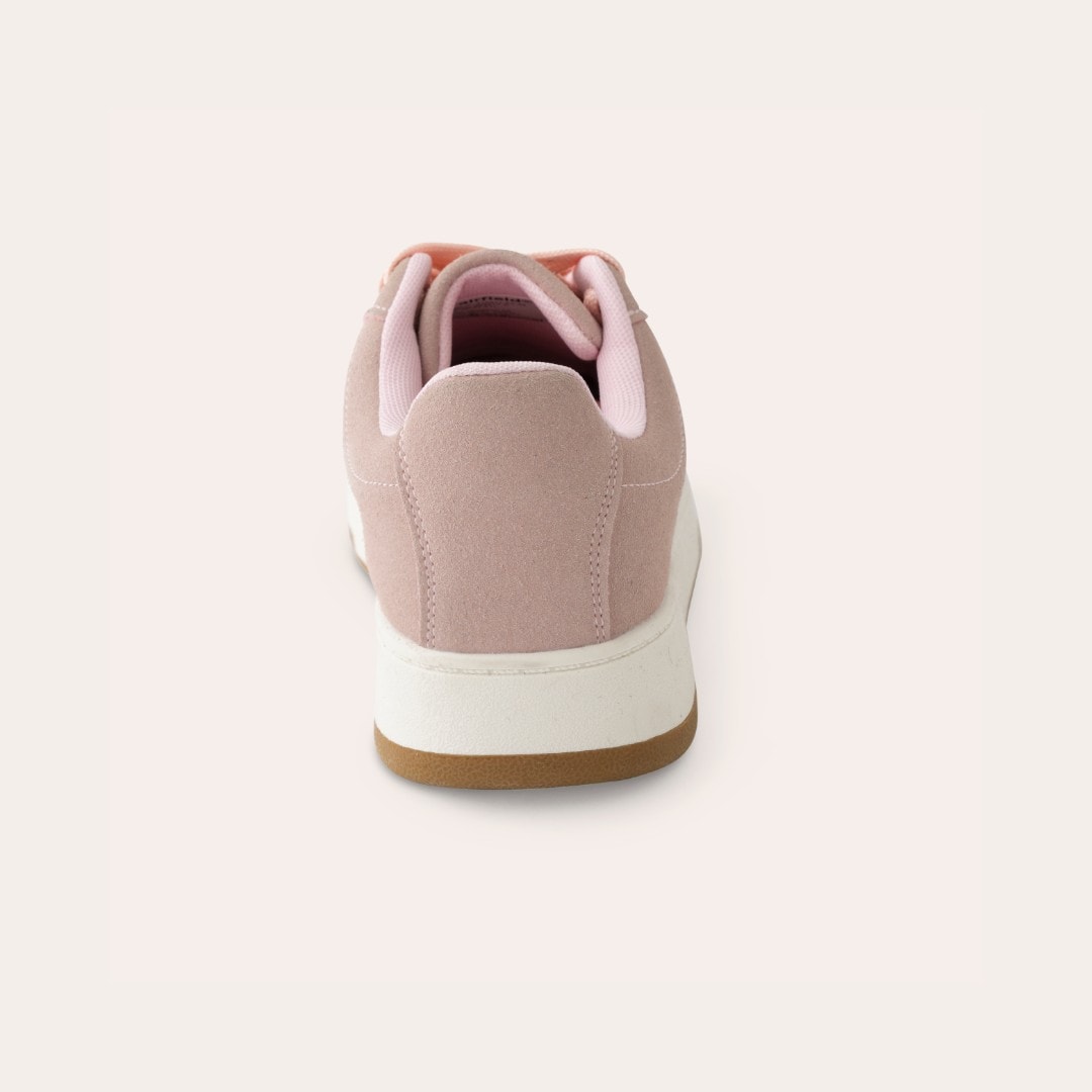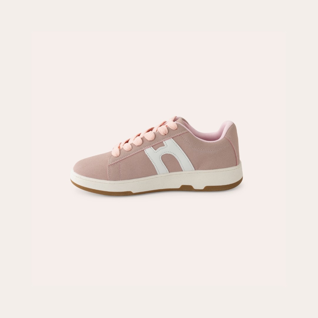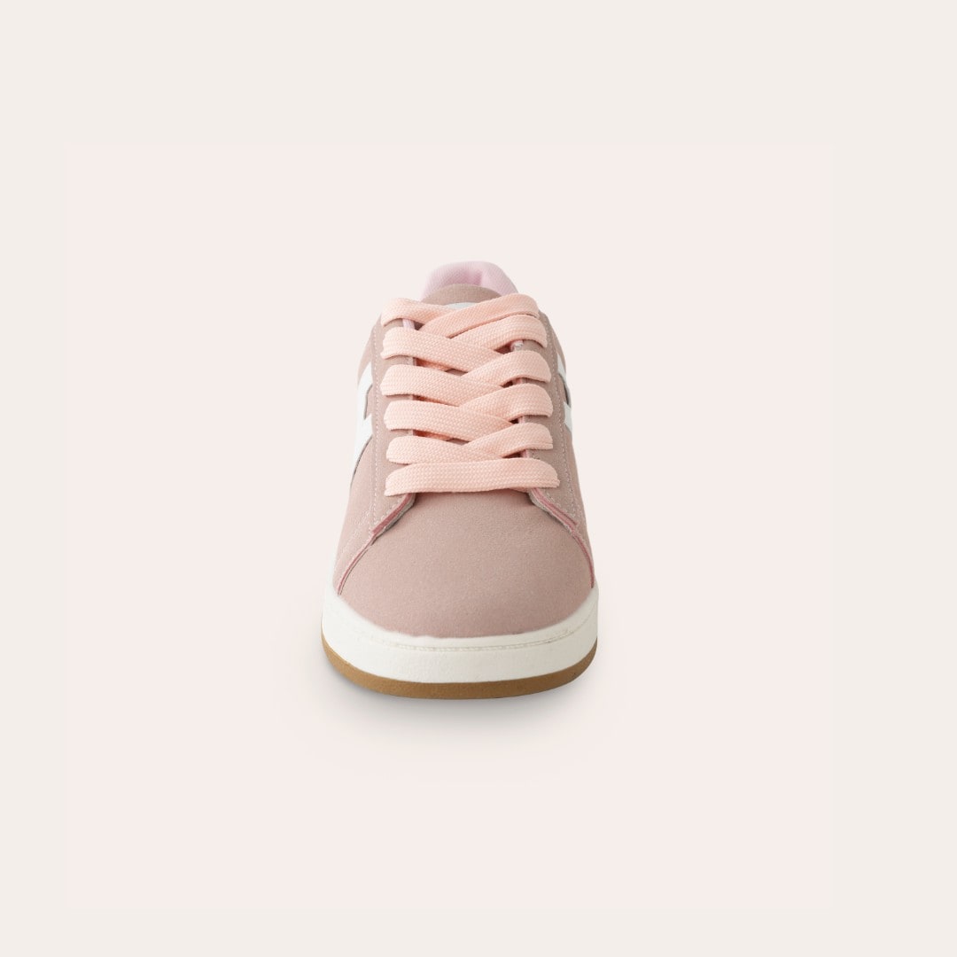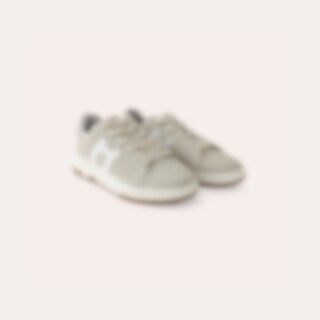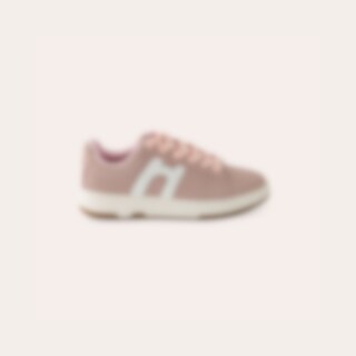 Sneakers i syntetisk ruskind med tofarvet ydersål. Dekoration på siden i kontrastfarve. Brede snørebånd. Lidt store i størrelsen.