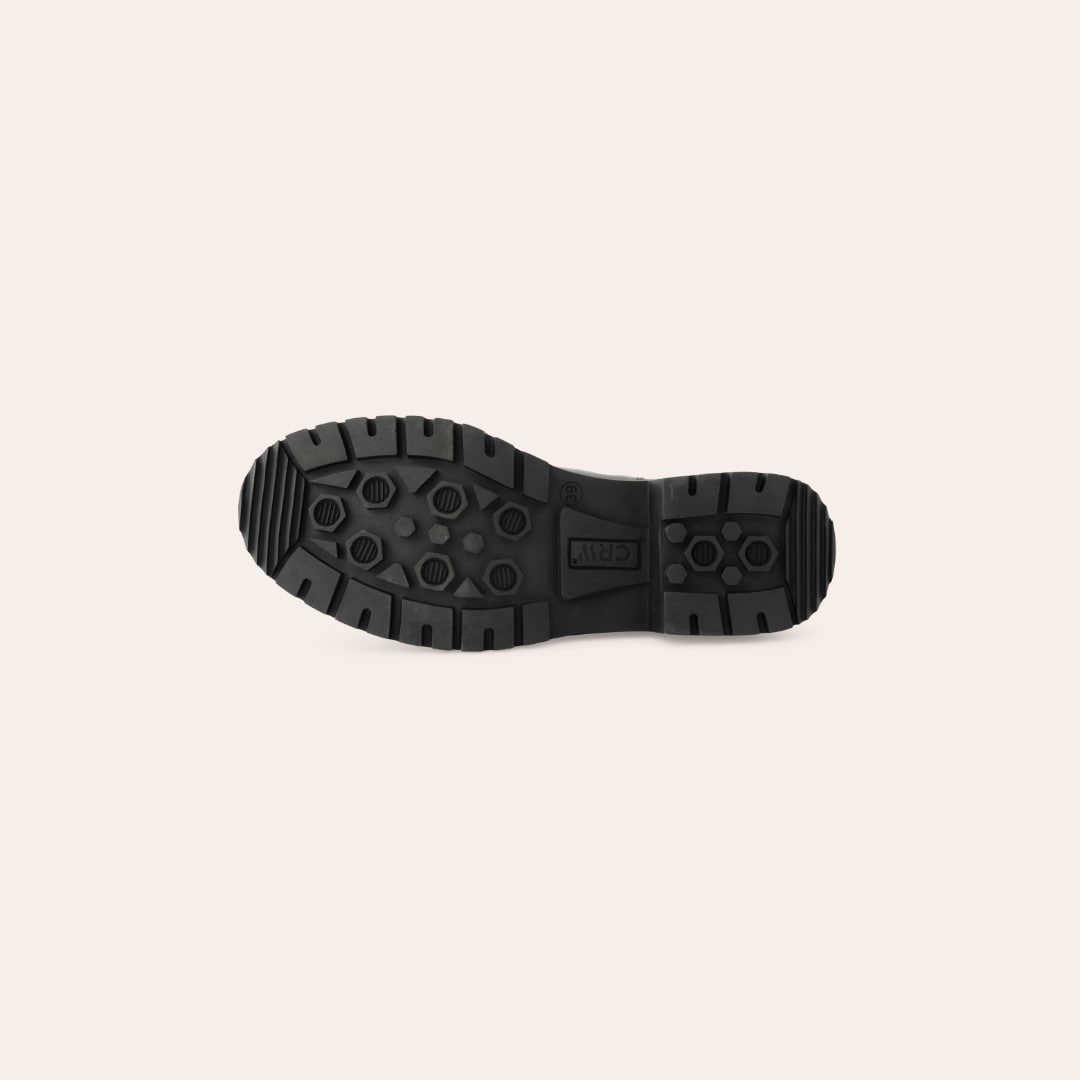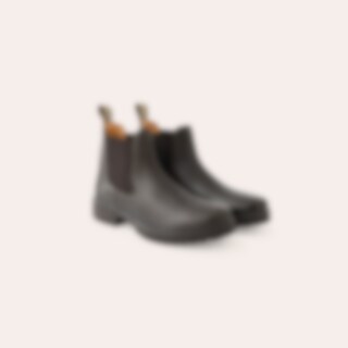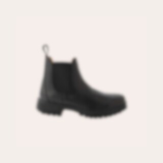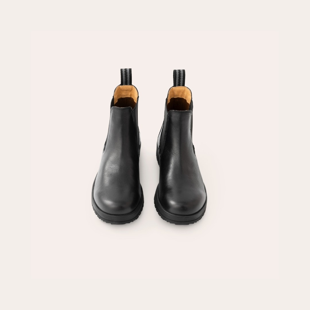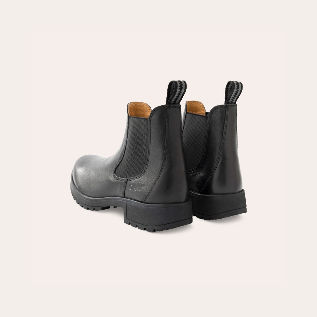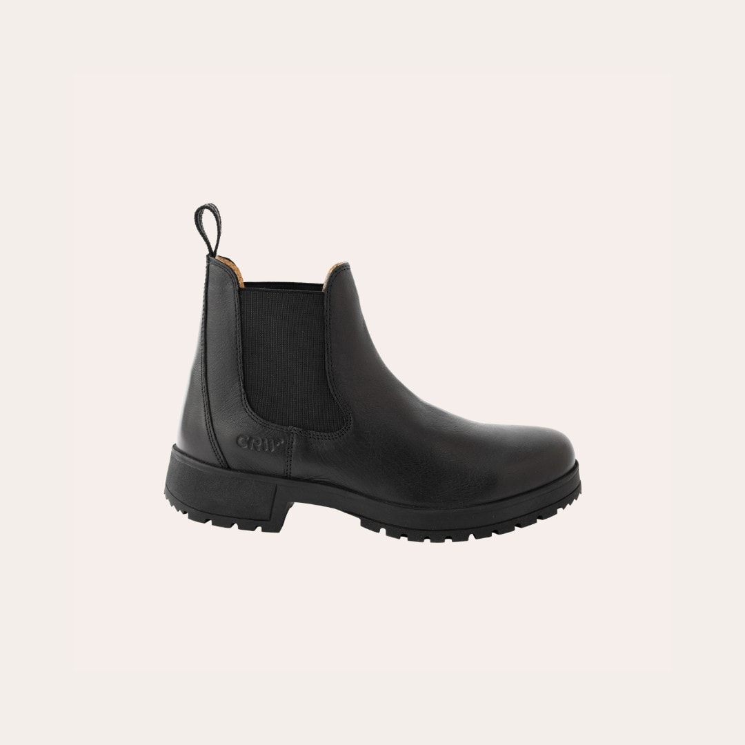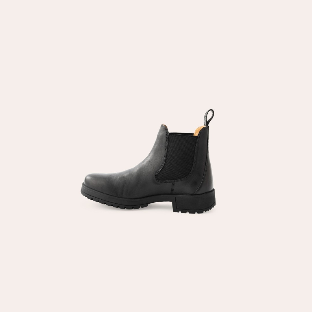 Jodhpur i blødt læder med elastik i siden, tekstilfor og tyk gummisål.