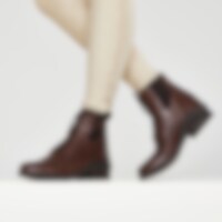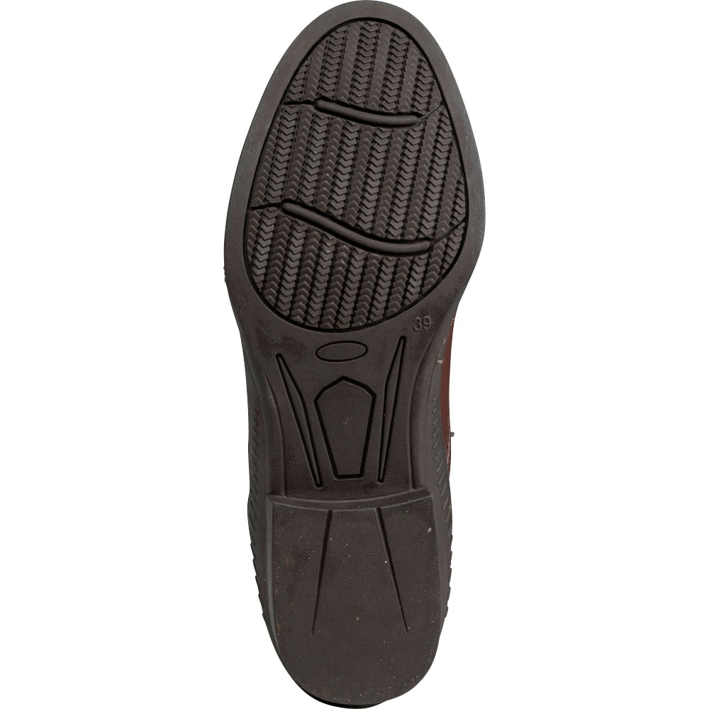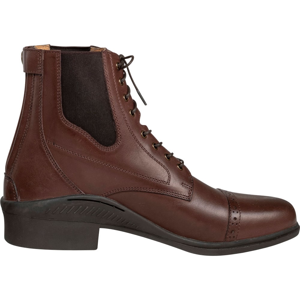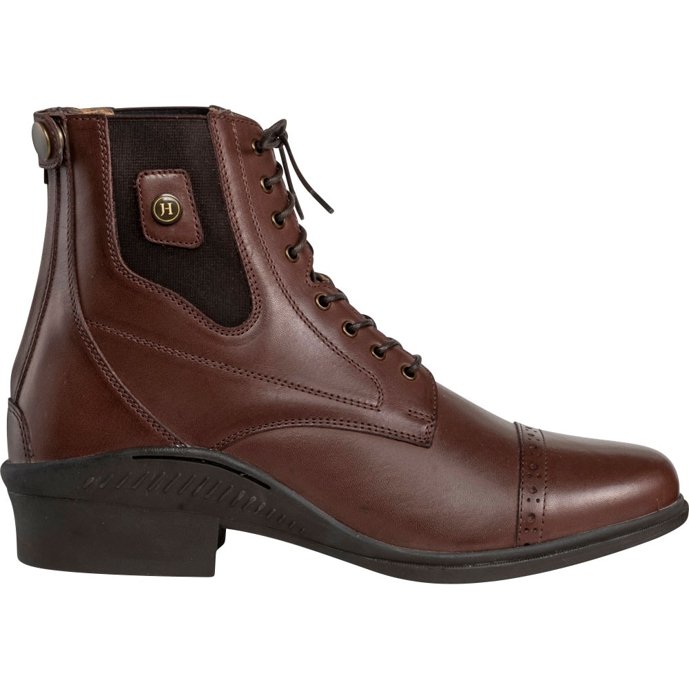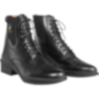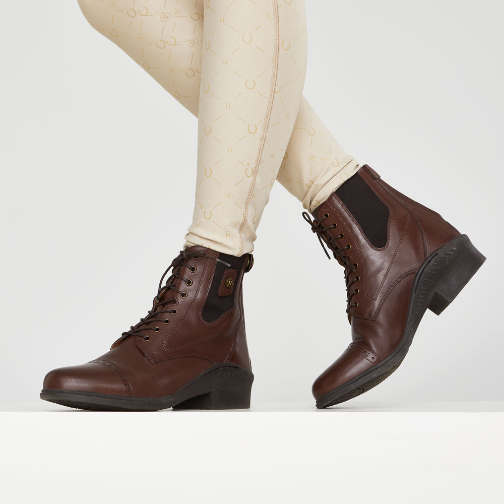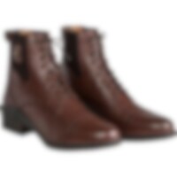 Klassiske jodhpurs med snører og broguemønster. Lynlås bagpå og elastik i siden. Skindforet inderside og indvendig sål i kunstskind. Ydersål i gummi.