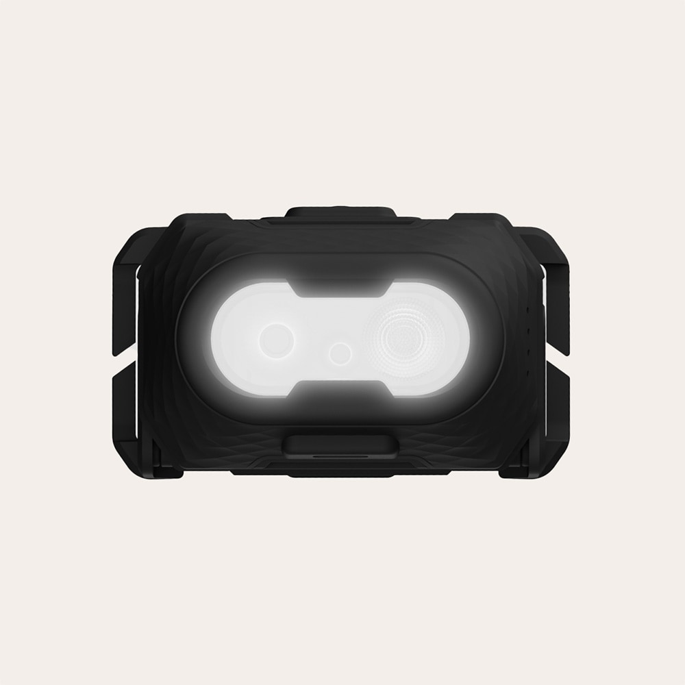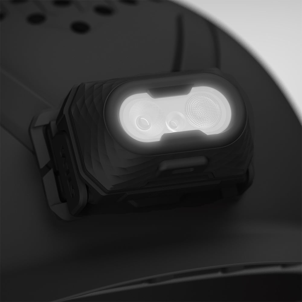 Let og praktisk genopladelig lygte (LiPo 700mAh) med fleksibel holder. Kombinerer langt spotlys og bredt floodlight med rødt og orange lys. Lygten er designet til nem montering på Y/elms hybridhjelm for at forbedre rytterens reaktionshastighed og synsstyr