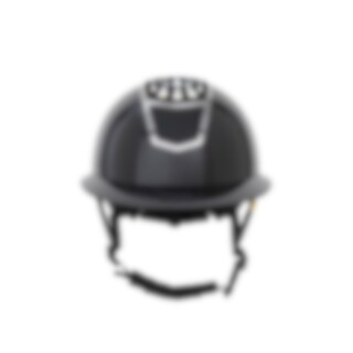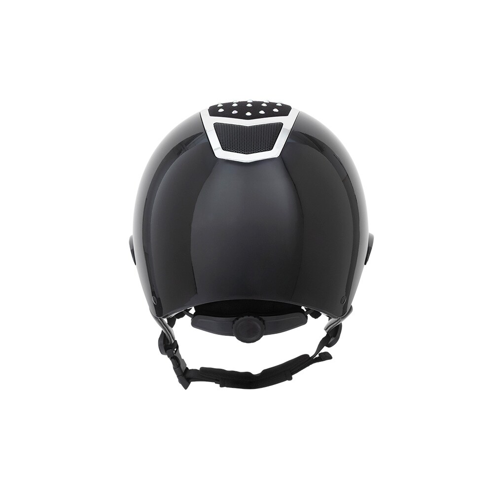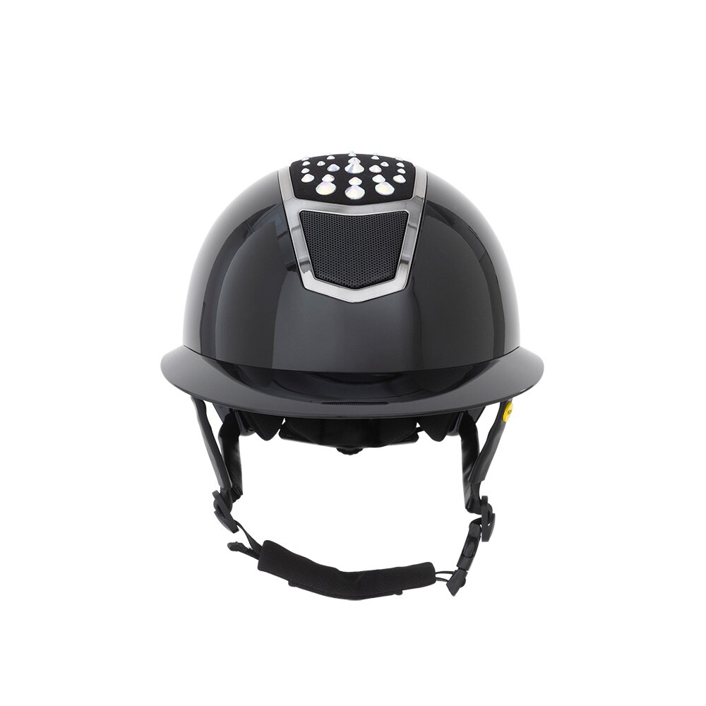 Ridehjelm godkendt i henhold til CE-standard EN1384:2023. Højglans metallisk finish og dekoreret midterplade. Lav vægt og ventilation foran og bagpå giver en hjelm, der er behagelig under hele rideturen. Justerbar med skrue bagpå giver gode pasformsmuligh