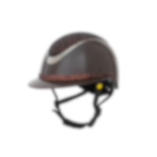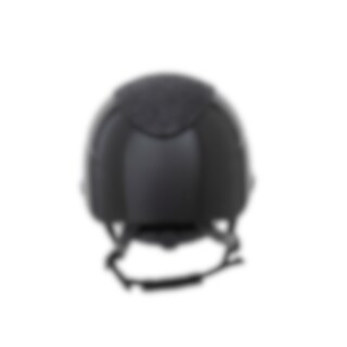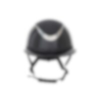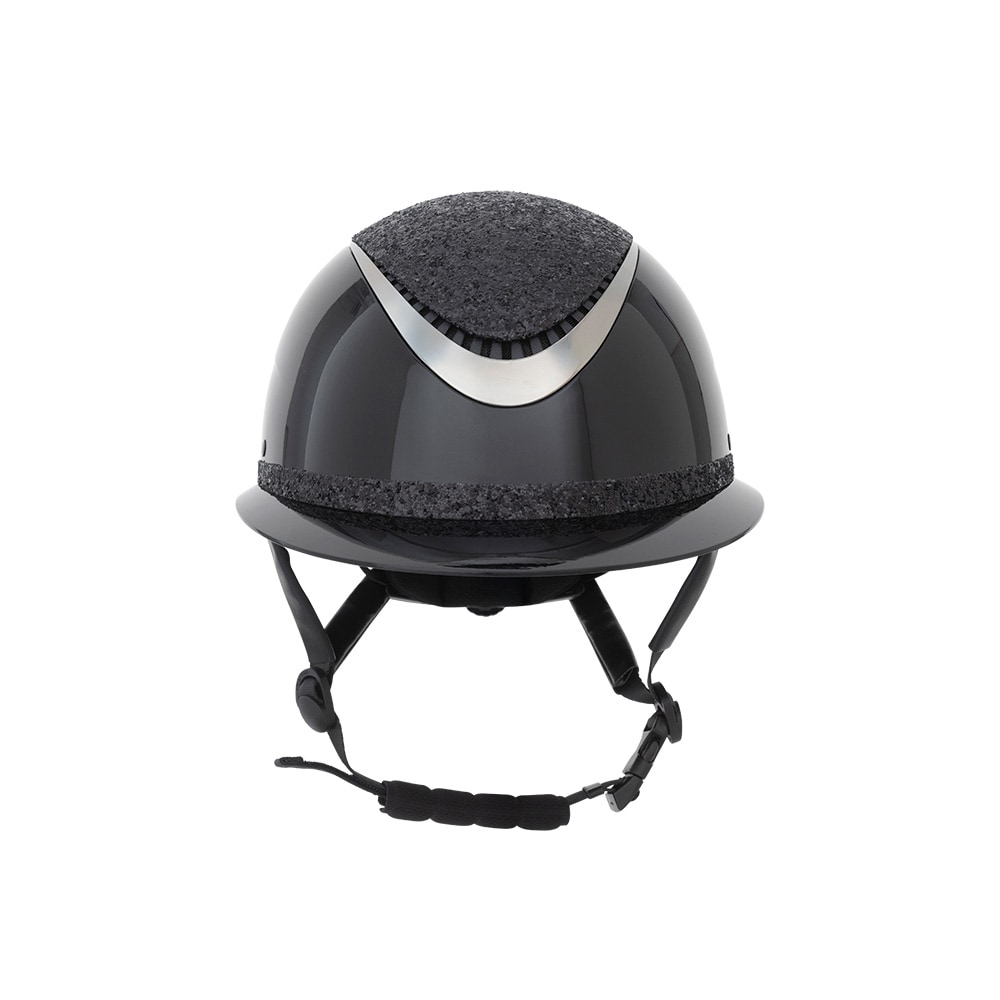Ridehjelm i højglans metallisk finish, dekoreret centerplade og dekorativ detalje over skyggen. Lav vægt og ventilation foran og bagpå giver en hjelm, der er behagelig under hele rideturen. Justerbar med skrue bagpå for gode monteringsmuligheder. Trepunkt