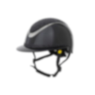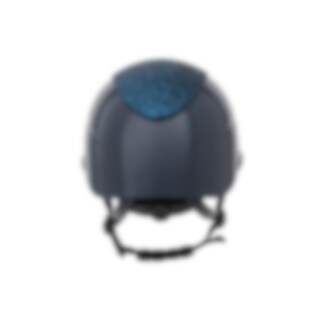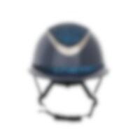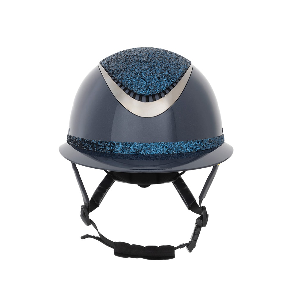 Ridehjelm i højglans metallisk finish, dekoreret centerplade og dekorativ detalje over skyggen. Lav vægt og ventilation foran og bagpå giver en hjelm, der er behagelig under hele rideturen. Justerbar med skrue bagpå for gode monteringsmuligheder. Trepunkt