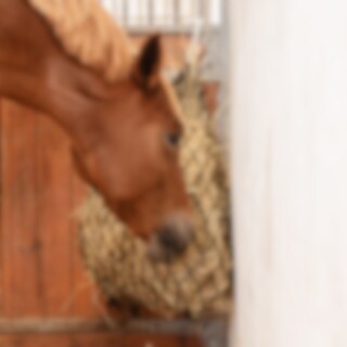 Slowfeeder-hønet med 5 x 5 cm hul. Størrelse S længde 80 cm ca. 4 kg, M længde 100 cm ca. 6 kg, L længde 115 cm ca. 8 kg hø.