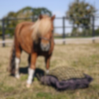 Høpude med velcro på kortsiden og med fire fastgørelsesmuligheder. I 600D polyester. Har mange anvendelsesmuligheder. Læg den på folden, så hesten kan æde på naturlig vis. Ikke til heste med sko, da de kan sætte sig fast. Kan også lægges på en palle med